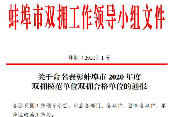 2020年,学校在蚌埠市双拥工作领导小组的指导下,以习近平新时代中国特色社会主义思想为指导,深入扎实开展双拥工作,双拥工作成果丰硕,获评“蚌埠市2020年度双拥模范单位”。